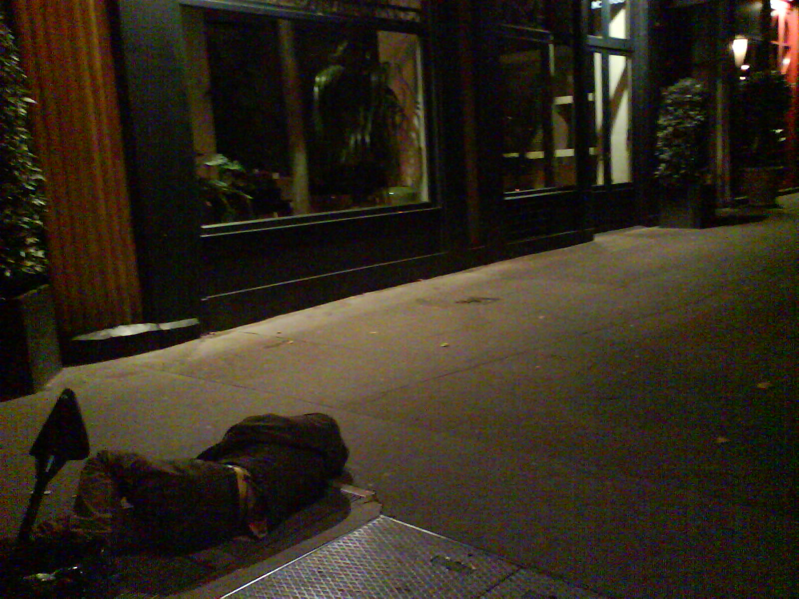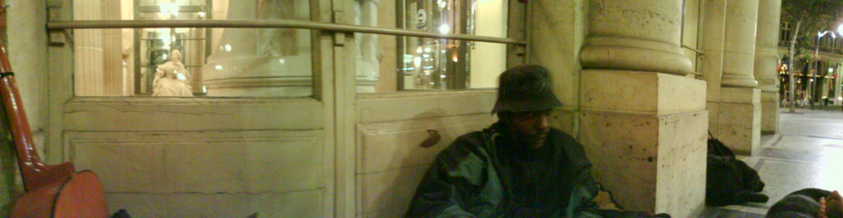 Pass one of the big discos, and chat with a few dudes on the way to an electro club. They ask about the sax case, and I break out the horn.Crank some blues and scrambled bop for 10 minutes. The giys like it and pop me some rum. Not in the mood for nightclubbing, and in anycase this looks like expensive commercial shite. In high spirits near the theatre de comedia, just around the corner, on my way to nowhere. Hear a dodgily tuned guitar playing hotel california. Wander near and start to sing ‘livin it up near the hotel de villa such a bourgeois place such a bourgeoius place’ and more on a similar vein. Invited into a cushy corner there by the African born guy playing … don’t think we ever swapped names. But we jam for a bit. He has an interesting style, partly african kora, partly blues, and an untunable guitar with a nearly broken neck, and missing tuning heads. He invites me to crash there … finds a blanket for me. More jam, and we’re joined by a polish guy and another french dude with half a dozen black dogs. The evening passes with music, and a conversation that crosses very close to conspiracy theory … where the money really is, how few people run the system … why one would choose the streets of this harsh and beautiful city as a home and lifestyle.